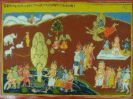 | Description / विवरण | Miniature painting based on Mahabharat - Adi parva. It depicts Devtas and demons doing Samudra manthan and many jewels, nectars and poisons coming out from the sea. |
