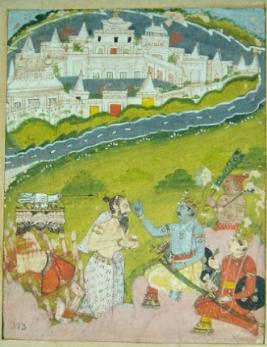 | Description / विवरण | Miniature painting based on Ramayana depicting after cremation of Ravan, Ram and Lakshman coronating Vibhishan. Hanuman is depicted behind Ram holding a chauri made of peacock feather. |
