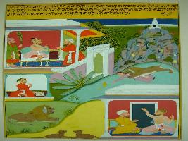 | Description / विवरण | Miniature painting based on Kalila Damana depicting Kalila and Damana sitting at lower part. At the lower left, two merchant are shown talking and sitting in his house. At right, lion is shown killing a man. At the upper side king is shown talking to a minister in a palace. Painting shows Mughal influence. |