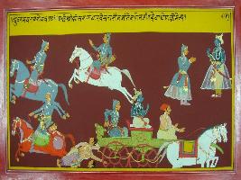 | Description / विवरण | Miniature painting based on Mahabharat - Udyam parva depicting Krishna after defeating the king of Gandhara arrested him and later freed him. |