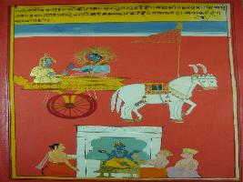| Description / विवरण | Miniature painting based on Shri Bhagwat Gita. It depicts Krishna preaching Arjun that the man who has very elevated mind, and if he worships me, he gets perfection. |