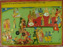 | Description / विवरण | Miniature painting based on Mahabharat - Adi parva. It depicts Devtas and demons fighting for nectar. At last Vishnu takes the form of Mohini and distributes the nectar among the Devtas only. |