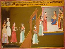 | Description / विवरण | Miniature painting based on Mahabharat - Virat parva. It depicts, Draupadi introduces herself as Sairandri, a maid of Draupadi. The queen of Viart says that she don t look like maid but looks like Devangana. |