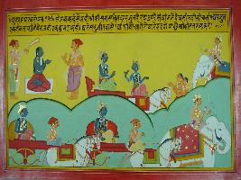 | Description / विवरण | Miniature painting based on Mahabharat - Udyam parva. The painting depicts Arjun with Krishna and Indra in the corner. While Sanjay is saying in the court of Hastinapur that if Arjun came to fight with Krishna man nobody can defeat him. |