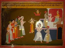 | Description / विवरण | Miniature painting based on Mahabharat - Virat parva depicting Pandavas are reaching on border of Virat State, worship Mata and entered in the city. |