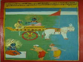 | Description / विवरण | Miniature painting based on Shri Bhagwat Gita. It depicts Krishna preaching Arjun that one who have lost and desire for body and not for soul s moksha is a fool. He do not know me and can never find me. |
