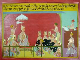 | Description / विवरण | Miniature painting based on Mahabharat - Udyam parva. The painting depicts that king Dhitrastra is sitting an his throne flanked by many officials than Sanjay come and asked him about Pandavas. The painting then depicts the court of Hastinapur. |