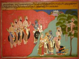 | Description / विवरण | Miniature painting based on Mahabharat - Virat parva depicting Pandavas are hiding their weapons and arms Ayudh tree. |
