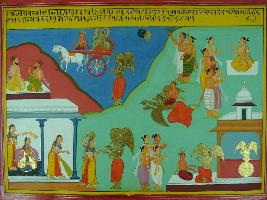 | Description / विवरण | Miniature painting based on Mahabharat - Adi parva depicting the birth of Garuda. The writing on top describes that Vanita was working in the house of sage Kaddle when she gave birth to Garuda. The lower part depicts Garuda coming to his mother and asking her the reason of her defeat. |