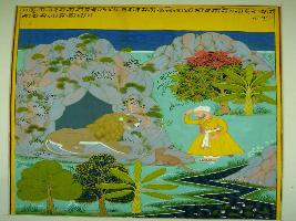 | Description / विवरण | Miniature painting based on Kalila Damana depicting Nahar is standing in front of Lion in a care and Kalila is standing near by Nahar. This painting show Mughal influence. |