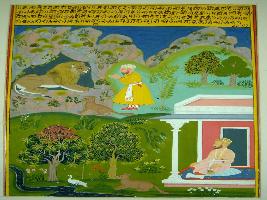 | Description / विवरण | Miniature painting based on Kalila Damana depicting sitting in a palace and near by Kalila is sitting at the lower part of painting at its upper part, king is shown in front of lion who is sitting on his care and Kalila is shown near by painting shown Mughal influence. |