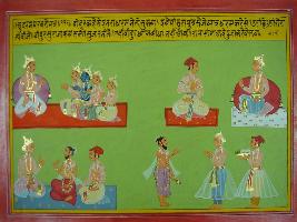 | Description / विवरण | Miniature painting based on Mahabharat - Udyam parva depicting Vidur teaching the Pandavas to do always right thing to be good rulers, Dritarasta is depicted sitting with Vidur and a rishi came to them they greeted the rishi with respect and listening to them. |