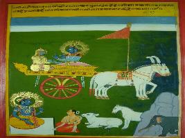 | Description / विवरण | Miniature painting based on Shri Bhagwat Gita. It depicts Krishna preaching Arjun that his duty is to create world and dissolute it at different interval of time. |