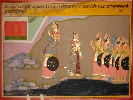 | Description / विवरण | Miniature painting based on Mahabharat - Virat parva depicting Daupadi is telling Yudhisthir that she is tired so should they stop.Then forh night Yudhisthir ask Arjun to take Draupadi on his shoulder and again they moved away. |