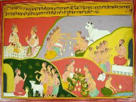 | Description / विवरण | Miniature painting based on Harivansha depicting Bhishma telling Yudhisthir about shradh katha. He told that Kaushik sage was having 7 sons. One day they took the cow of Brihgu sage and killed it and ate it. Later they told the sage that lion killed the cow. |
