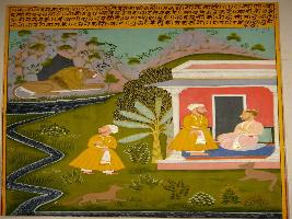 | Description / विवरण | Miniature painting based on Kalila Damana. On the upper part a lion is depicted seated in front of his den. On the lower part 2 men are depicted in the house and one man out of house and there is two foxes Kalila and Damana. Mughal influence can be seen. |