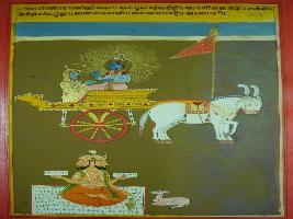 | Description / विवरण | Miniature painting based on Shri Bhagwat Gita. It depicts Krishna preaching Arjun that all the world surrounds him. He is the nature, and whole universe. |