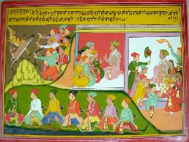 | Description / विवरण | Miniature painting based on Harivansha depicting that the seven sons of sage taking birth in next life as sons of Vyadh and hunting for serving their parents. |
