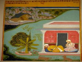 | Description / विवरण | Miniature painting based on Kalila Damana. On the upper part a lion is depicted sitting out of his den on the lower part and damana playing out in courtyard. Mughal influence can be seen. |