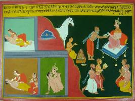 | Description / विवरण | Miniature painting based on Mahabharat - Adi parva depicting Pandu telling Kunti about king Bishita who did Ashwamegh yagna. Then he got a female namely Kashpivati. By seeing her he got attracted towards her and made love. After that he got seven sons from her. |