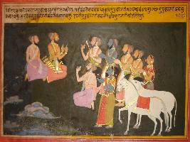 | Description / विवरण | Miniature painting based on Mahabharat - Virat parva depicting Yudhisthir asking other Pandavas and Draupadi about their changed identify in exile. Arjun said he will be residing as Vrihannala, Bhim as Vallabh, a cook, Nakul as care taker of horse and Shadev as Tantripal to look after cows, while Draupdi as Sairandri and work as maid. |