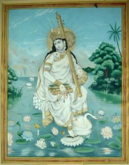 | Description / विवरण | Miniature painting depicting Saraswati on swan holding books in right hand and veena in left hand. She is adorned with jewels and a beautiful crown. |
