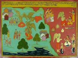 | Description / विवरण | Miniature painting based on Mahabharat - Adi parva depicting at the lower left Garuda talking to his mother. At the right side Garuda eating human. |
