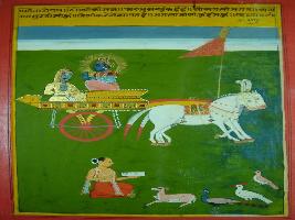 | Description / विवरण | Miniature painting based on Shri Bhagwat Gita. It depicts Krishna preaching Arjun that all the living beings on earth which lives on earth inside them, I am the soul which resides in them. |