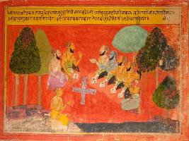 | Description / विवरण | Miniature painting based on Mahabharat - Virat parva depicting Arjun asking Yudhisthir where he will reside on Agyalvas. Yudhisthir said that he will reside by name ot Kanka in Virat Nagar as will work at court person of Virat king. |