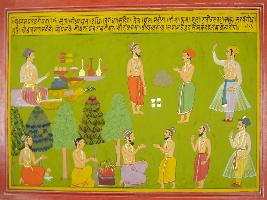 | Description / विवरण | Miniature painting based on Mahabharat - Udyam parva depicting a Brahman could not sell salt, food, curd, milk, oil, butter, wine, til, fruits, grass and other sweets. It also depict sages survies by eating fruits. |