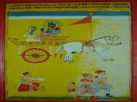 | Description / विवरण | Miniature painting based on Shri Bhagwat Gita. It depicts Krishna preaching Arjun that one who do not believe in god and Dharma, he can not get moksha from the cycle of birth and death. |