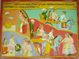 | Description / विवरण | Miniature painting based on Harivansha depicting a seated man with five priests in the left up corner and below them a king with his queen are offering food to two men. While in the right side the king and queen are seen on chariot and then they meet two men. |