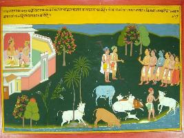 | Description / विवरण | Miniature painting based on Mahabharat - Virat parva depicting Pandavas with Draupadi going to Virat nagar. They are shown coming to Viratanagar and talking to cow herds. |