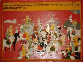 | Description / विवरण | Miniature painting based on Prithviraj Raso depicting Prithviraj and Sanjogita in the centre of the painting and army of king Panga trapped the army of Prithviraj. |