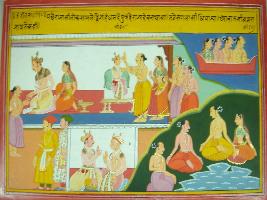 | Description / विवरण | Miniature painting based on Harivansha. On the upper part king Silok leaving his kingdom after donating wealth and leaving his kingdom to his son, then he got the Siddhi. |