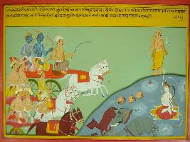 | Description / विवरण | Miniature painting based on Mahabharat - Rajdharma parva. All the Pandavas are depicted on chariot in Kurukshetra and the place is scattered with horse, elephant, heads and Shiv is depicted sitting in the field and Parasurama is depicted on the way of Krishna. |
