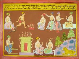 | Description / विवरण | Miniature painting based on Mahabharat - Udyam parva depicting that people should not disobeyed snakes, agni and Brahmans. Agni can burnt a house. It aslo depict king is like a cripper coverning the kingdom in the way cripper covers a tree. It also depict a tiger sitting in a jungle. |