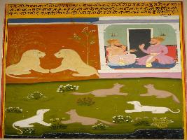 | Description / विवरण | Miniature painting based on Kalila Damana. On the upper side is the depiction of two lions and two men talking. On the lower side three foxes are depicted with two dogs. Mughal influence can be seen. |