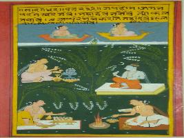 | Description / विवरण | Miniature painting based on Sarangadhar depicting two heavenly bodies seated on the Vayuyaan at the upper part of the painting, below them a person is worshipping Shiv linga and Shiv is seated in front of him. Lower part of the painting depicts a scene of yagna. |