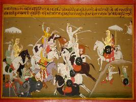 | Description / विवरण | Miniature painting based on Prithviraj Raso depicting fight between the armies of king Prithviraj and Panga. Prithviraj and king Panga fighting as if Bhim and Dushashan is fighting. |