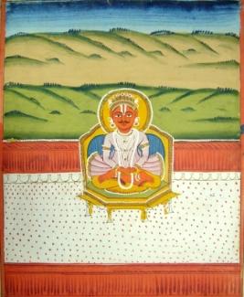 | Description / विवरण | Miniature painting depicting a man, probably a griha sitting on a throne. A halo is seen behind head. Floral borders are seen around it. |