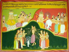 | Description / विवरण | Miniature painting based on Harivansha depicting Brahma with his seven sons called Saptarishi at the upper right part. In the centre, depiction women standing on either side of a tejaswi saint and a small child standing near. In the left portion of the painting Brahma on chariot with Chandra talking to the seven saints. |