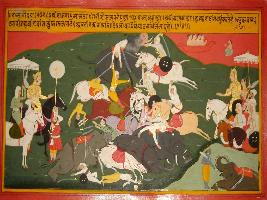 | Description / विवरण | Miniature painting based on Prithviraj Raso depicting fight between the army of king Panga and nobles of Prithviraj. Prithviraj depicted on the left hand side of the painting with Sanjogita while king Panga on the right side of the painting. |