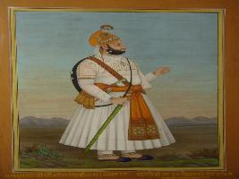 | Description / विवरण | Full length portrait of Maharana Bhim Singh, in standing position, facing left. He is holding a sword in his right hand while his left hand pointed forward. He is wearing and elaborate well designed turban, well dressed and adorned with jewels. |