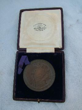 | Description / विवरण | It is a circular medal written as 1910, The unified provinces exhibition, Allahabad . It is decorated with human figures one male and two females and other things on front side. The back side is having floral and cripple notif and written as swarded to, it has a cover |