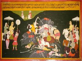 | Description / विवरण | Miniature painting based on Prithviraj Raso depicting the armed strength of the king Panga and Prithviraj depicting Panga on the right side, and Prithviraj on the left side. |