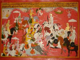 | Description / विवरण | Miniature painting based on Prithviraj Raso depicting the fight between the armies of king Panga and Prithviraj. Prithviraj with Sanjogita is depicted on the left hand side of the painting. |