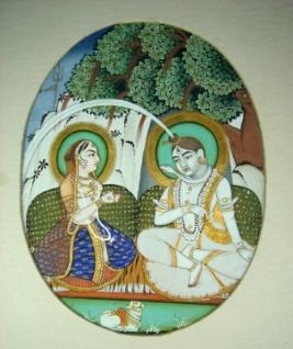 | Description / विवरण | Miniature painting depicting Shiva and Parvati in sitting position. Parvati is sitting before Shiva with folded hands and Ganga is depicting coming out from Shiva s jata. Both are well adorned with jewels. His vahan Nandi is depicted seated below. |