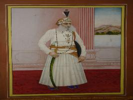 | Description / विवरण | Full size portrait of Maharana Fateh Singh 1884-1930 in standing position. facing right holding a sword and shield in left arm. He is wearing a royal turban and well dressed and adorned with jewels. |