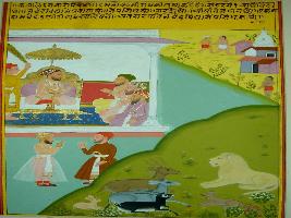 | Description / विवरण | Miniature painting based on Kalila Damana depicting the story of a city Vaidya. He is very skilful in the surgery, then he appointed an inexperienced doctor and later on he became very famous doctor. Painting having Mughal influence. |